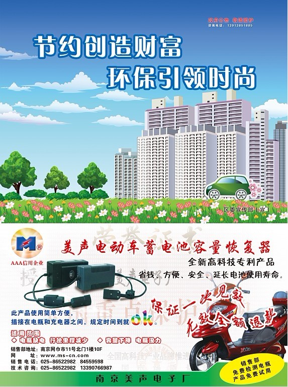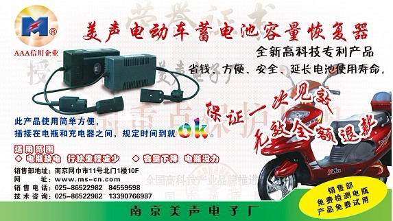 为庆祝五一劳动节,全 新 高 科 技 产 品 容量恢复器100元48V全国包邮 设计理念 铅酸蓄电池是一种价格相对便宜,应用广泛的电池。特别在电动车行业大都以铅酸蓄电池为动力。但在实际使用中,由于铅酸蓄电池特性随使用时间的增长,电池内阻也逐步增加,现电动车充电器均为恒流,恒压方式充电电池内阻增加后,电量未充满充电器提前停止充电。当电阻增加到使充电量低于60%时,该电池即不能正常使用,由于电池内阻增加后,伴随着电池受电能力下降,就是提高充电电压,也无法提高电池充电量。 电动车电瓶(卫士)容量恢复器,即解决了电池内阻增加,无法充足电量,提前报废的难题,只要电池内部未出现短路或断路,电池内液体处于正常状态时,均能使已报废或接近报废电池的电量恢复充到其额定电量的86%以上。大部分电池可达96%以上;应用了世界首创的蓄电池充电与维护理论新概念,确保一次见效。 使电动车的旧电瓶恢复接近新电瓶一样用的爽、跑的快! 电动车电瓶(卫士)容量恢复器适用范围。 1。正在使用中电动车电池容量下降,行驶里程减少。 2。正在使用电动车电池出现;刚充则满,一用就光,即充电器充电时间很短,充电器就停止充电,行驶里程很少就不能行驶。 3。电池没力,就是新电池也感觉力量不足。 4。天气变冷时,电池容量下降。 5。长时间不用电池和电池电压过高充不进电。 6。已报废电池或接近报废电池。 本容量恢复器对严重缺液电池,恢复效果将变差,此时只要少量补充液体即可,当电池内活性物资严重脱落时,恢复效果将变差,但这种状况出现较少,理论上只要未出现电池内部短路或断路的电池就能一直使用。 本产品效果明显,只要使用一次就会见效,这完全不用于其它同类产品。